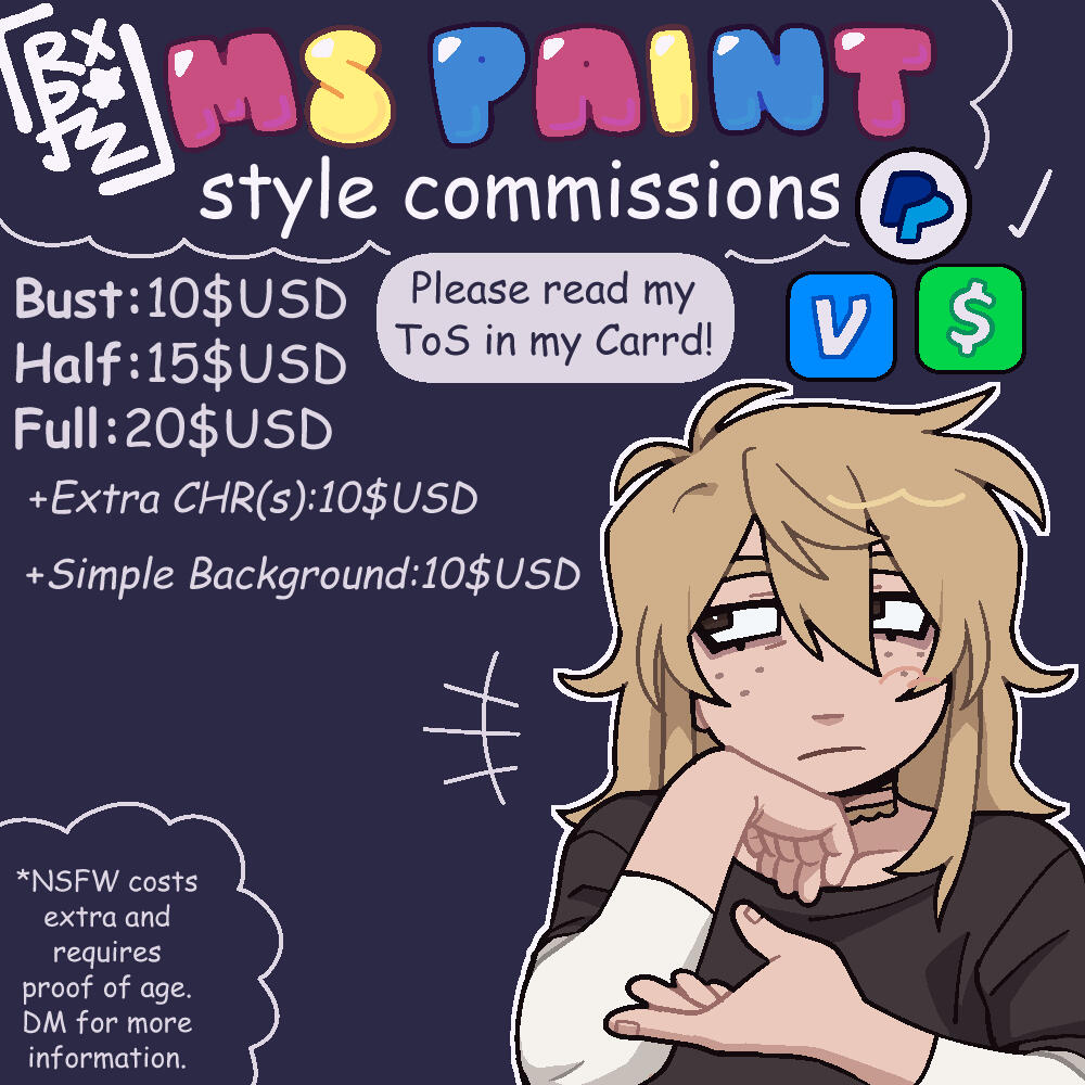 -The client has my permission to repost the artwork wherever they would like, as long as proper credit is given (a link back to one of my pages) and my watermark/signature remains intact and unaltered.4. If these terms are broken, you will be privately blacklisted from commissioning me and reported.———————————————SECTION II. PAYMENT INFORMATION1. I accept payment via Cashapp or Paypal.2. You will be given 24 hours to pay after a commission slot is taken. Non-payment within 24 hours will result in the commission being cancelled.3. It is the commissioner's responsibility to tell me when the payment has been sent. Sometimes a payment will not fall through and I won't know about it. If you fail to tell me that you've sent the payment within 24 hours - and I know I absolutely haven't received the payment - then the 24 hour payment term applies to you.4. Refund Policy